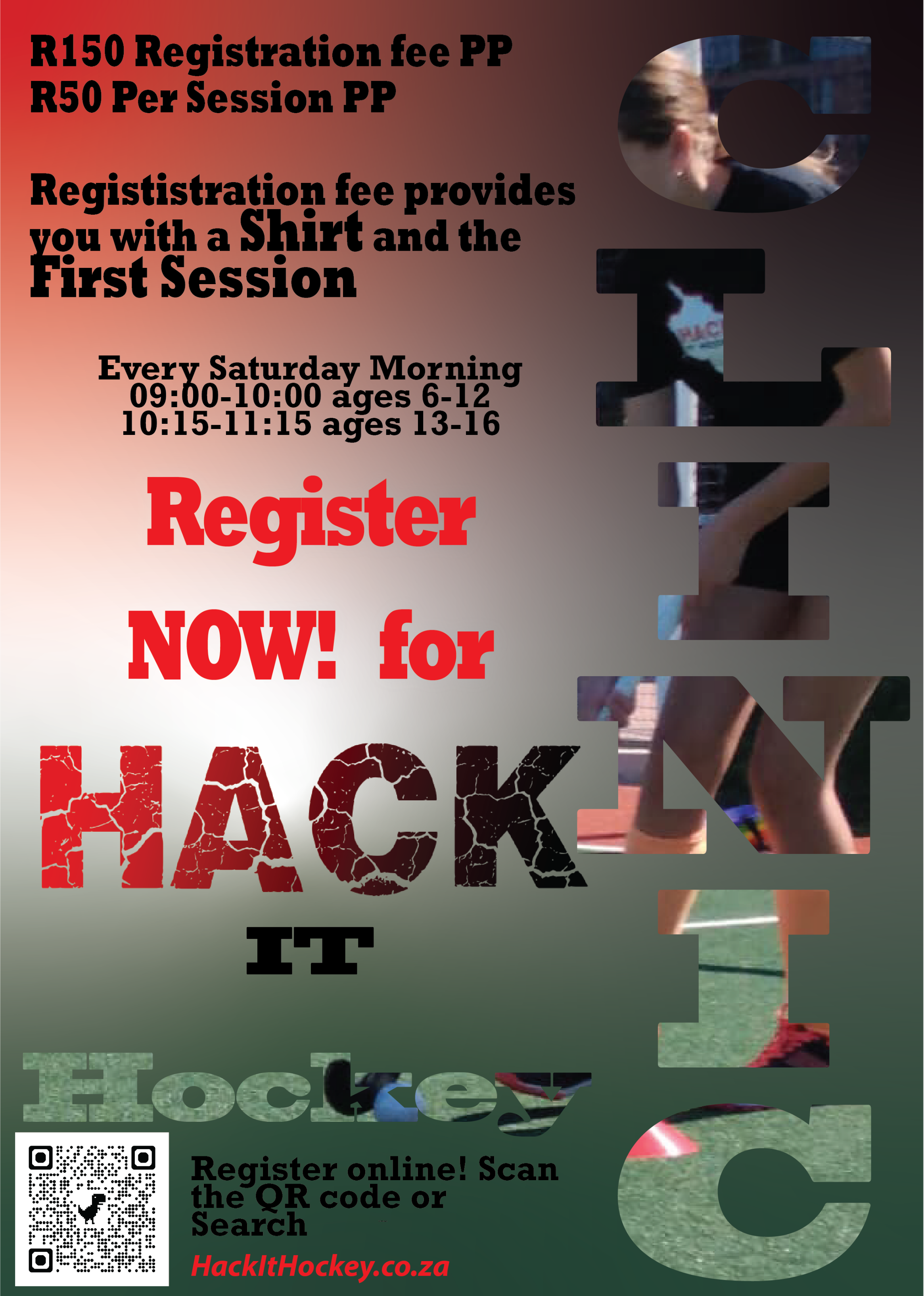 Your first session can be registered for on our Clinic Registration Form at a fee of R150 Per Person Per First Session, This fee provides you with your Hack It Hockey Shirt and your first session. Every session after is priced at R50 Per Person Per Session. The registration fee payment is required before Thursday in order for your Hack It Hockey Top to be ready for the Saturday.The session fee can be payed up until the session of the same week.